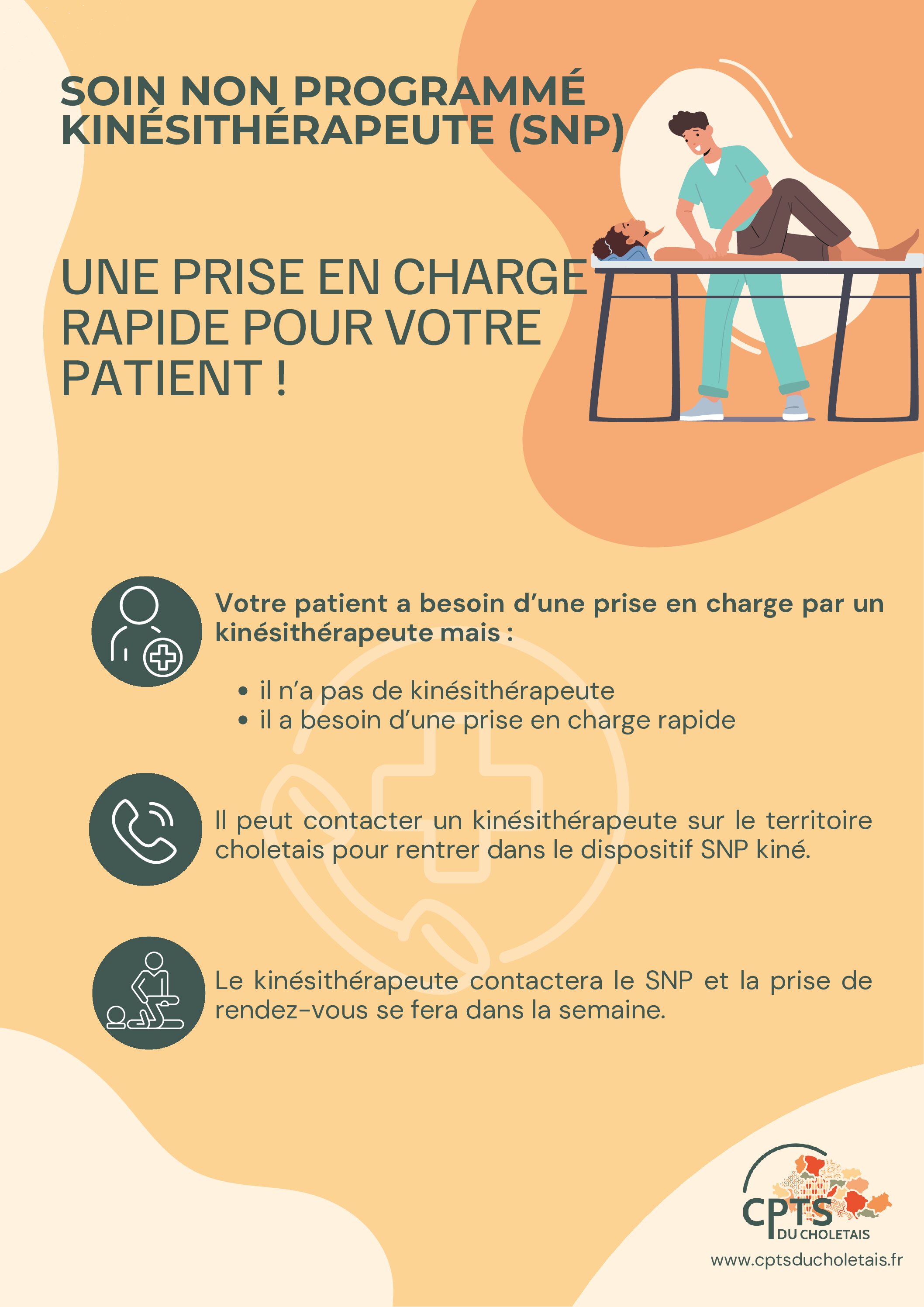 Si celui-ci n’a pas de disponibilité, il fait appel au dispositif SNP, qui oriente le patient vers un kinésithérapeute d’astreinte.